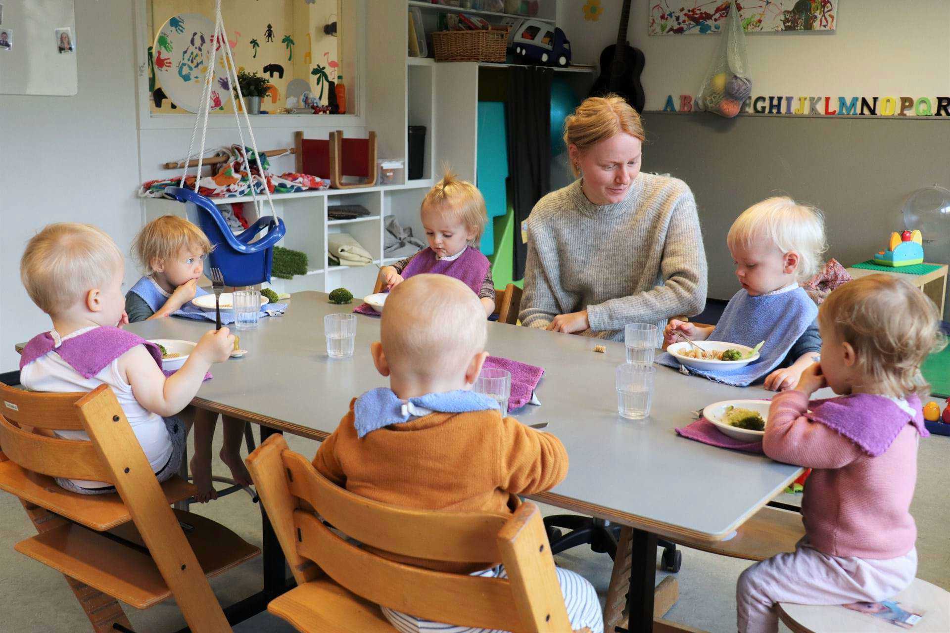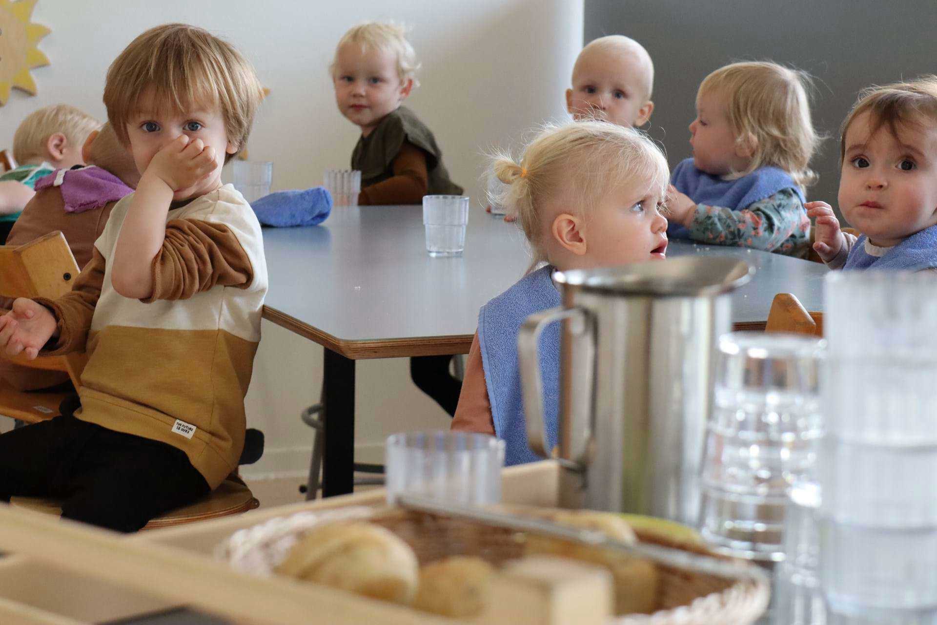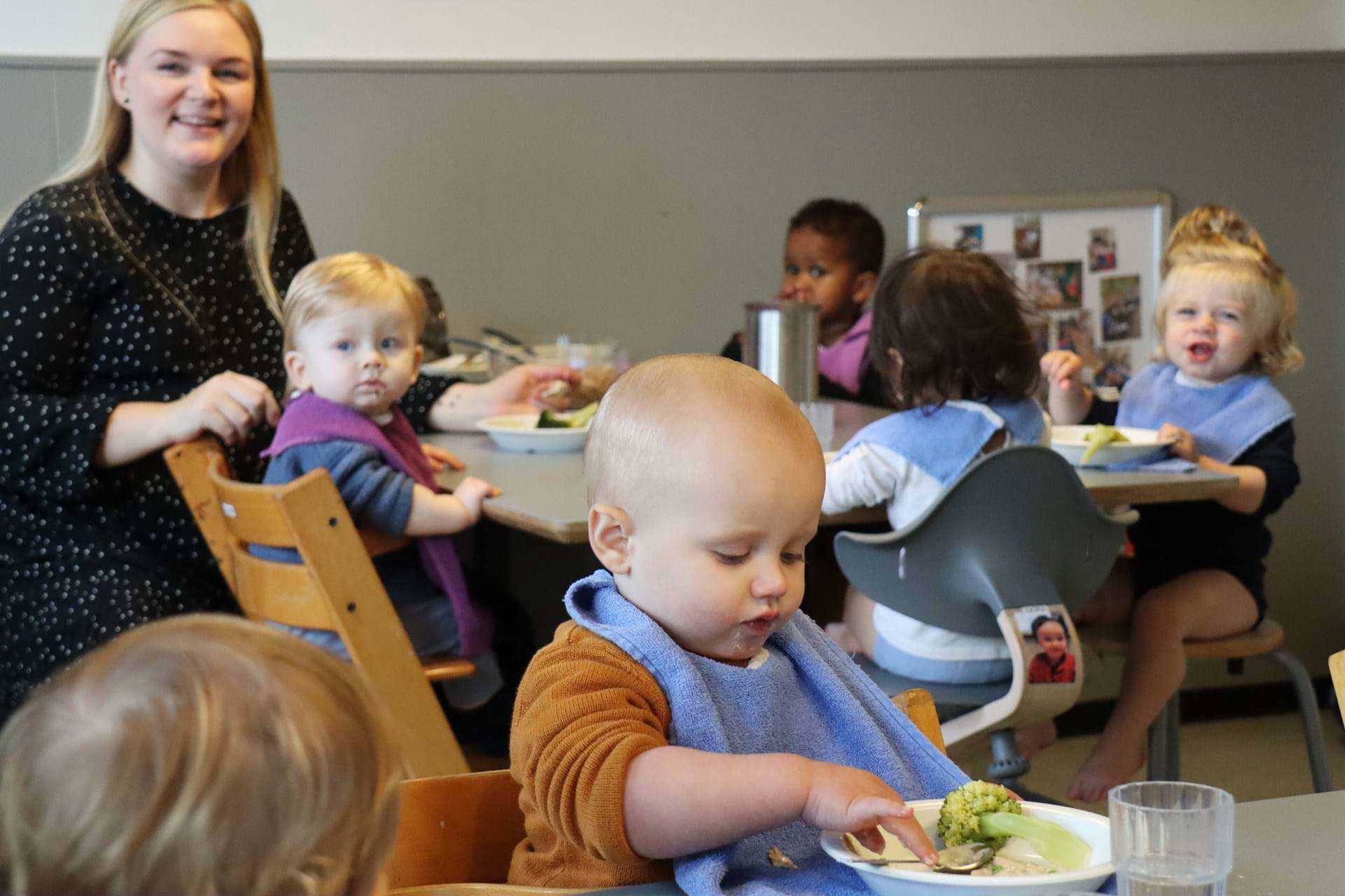 Kl. 10.30 serveres der frokost fra køkkenet og børnene spiser på egen stue med faste voksne. Herefter puttes der børn - nogle sover i krybber/barnevogne og de store børn sover på madrasser på stuerne.
